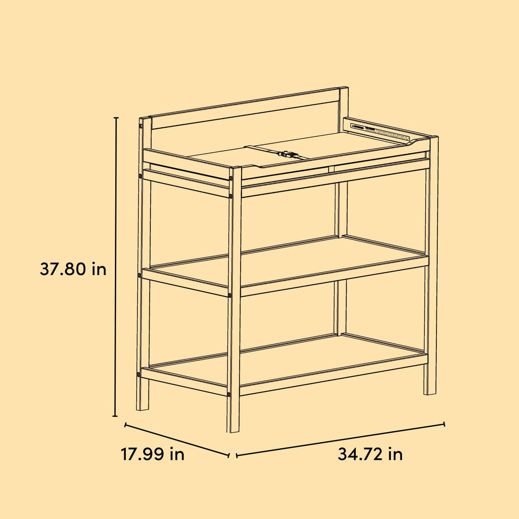 Changing table with storage shelves: Our changing table includes two (2) open storage shelves, allowing you to keep your changing essentials nearby and organized.