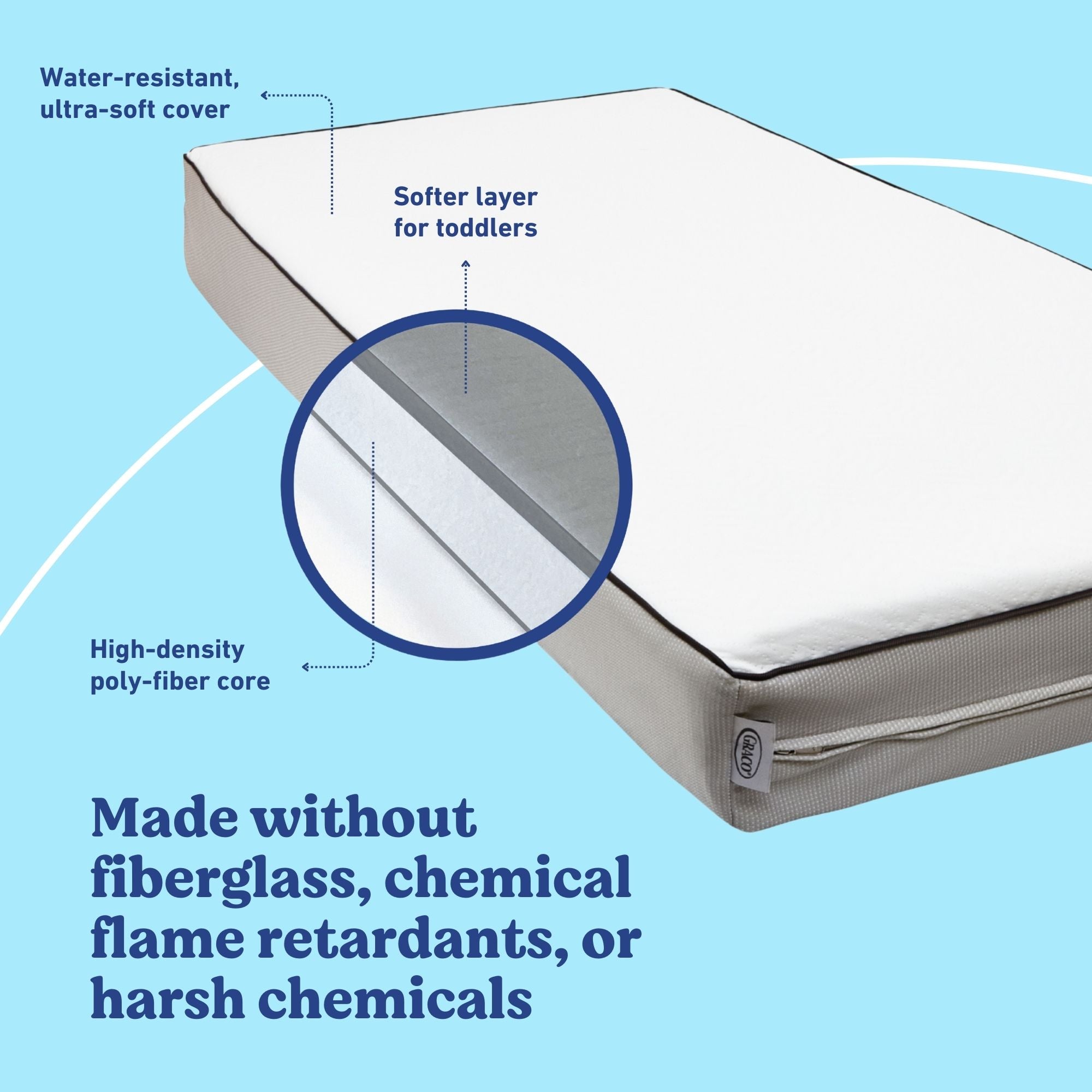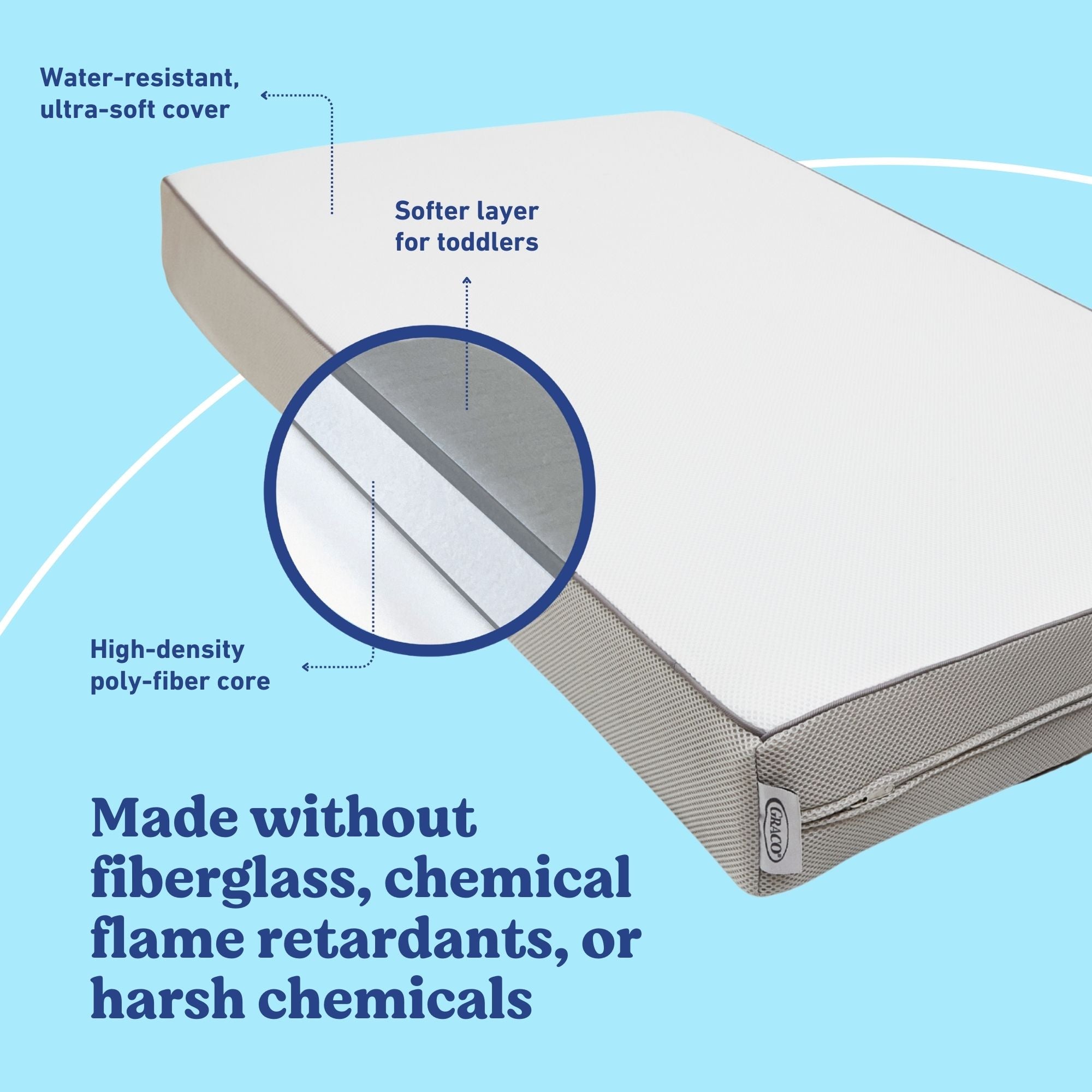 Proudly made in the USA (with U.S. and imported materials), this Graco® baby crib mattress and toddler bed mattress features a high-density poly-fiber core (made with recycled content) and is free from fiberglass and chemical flame retardants. Designed to fit any standard full-size crib or toddler bed.