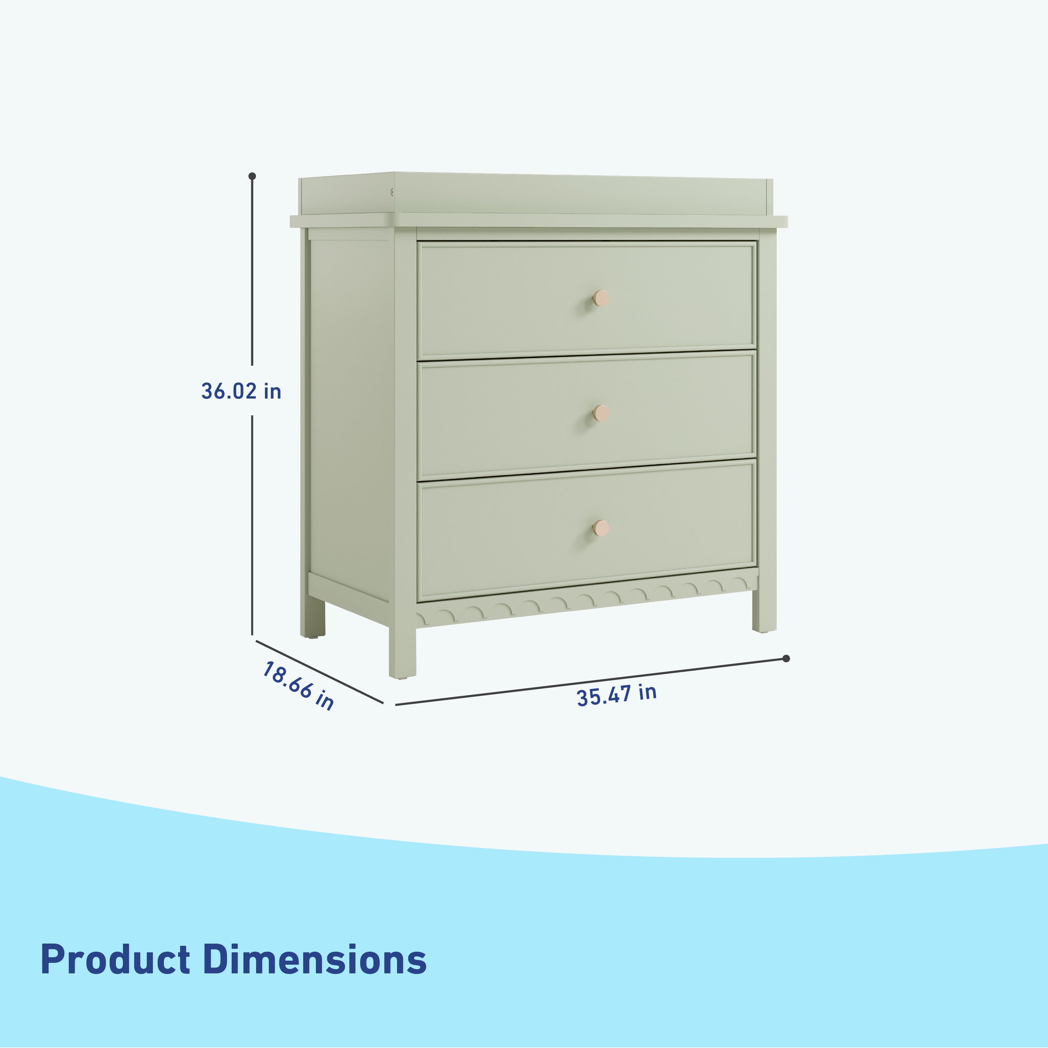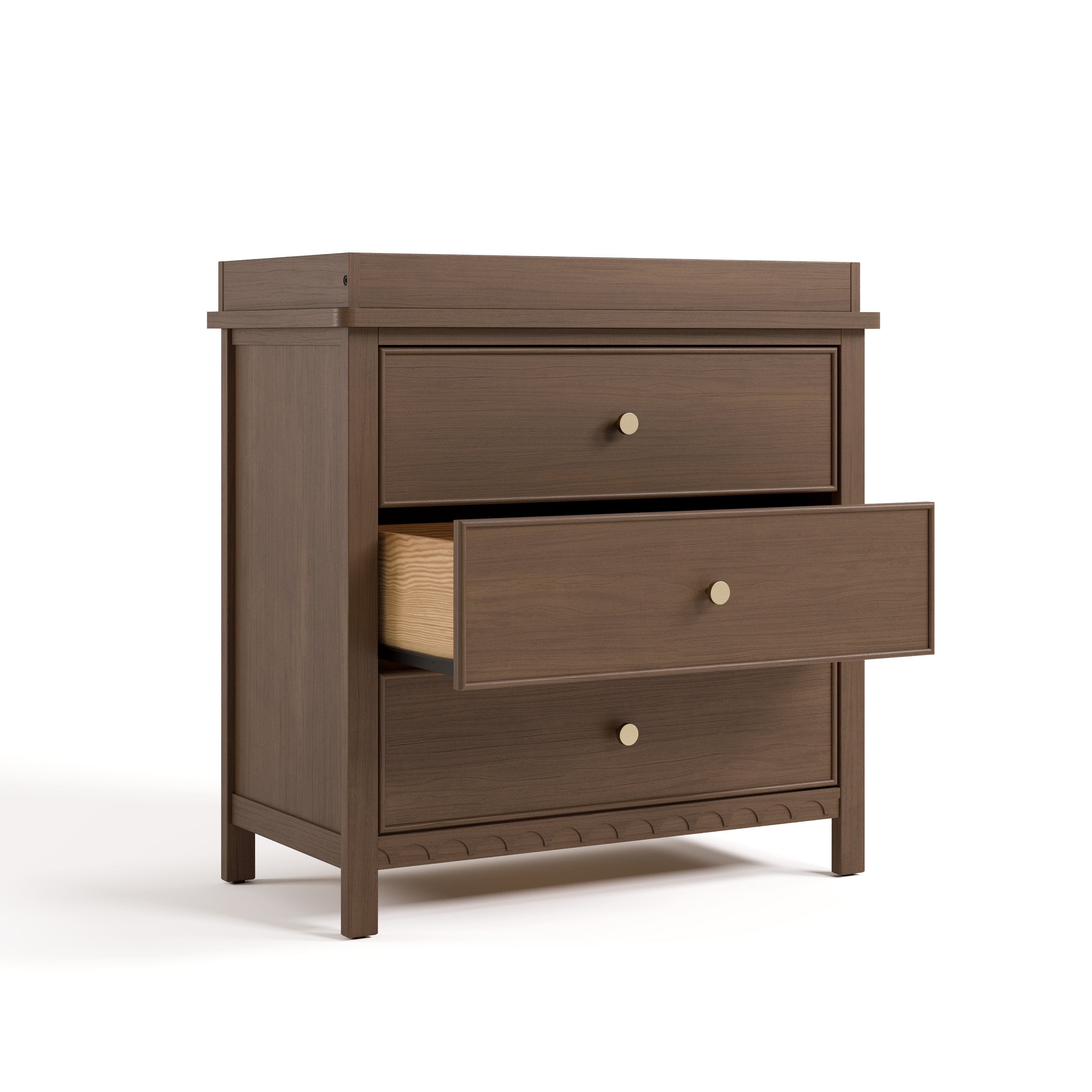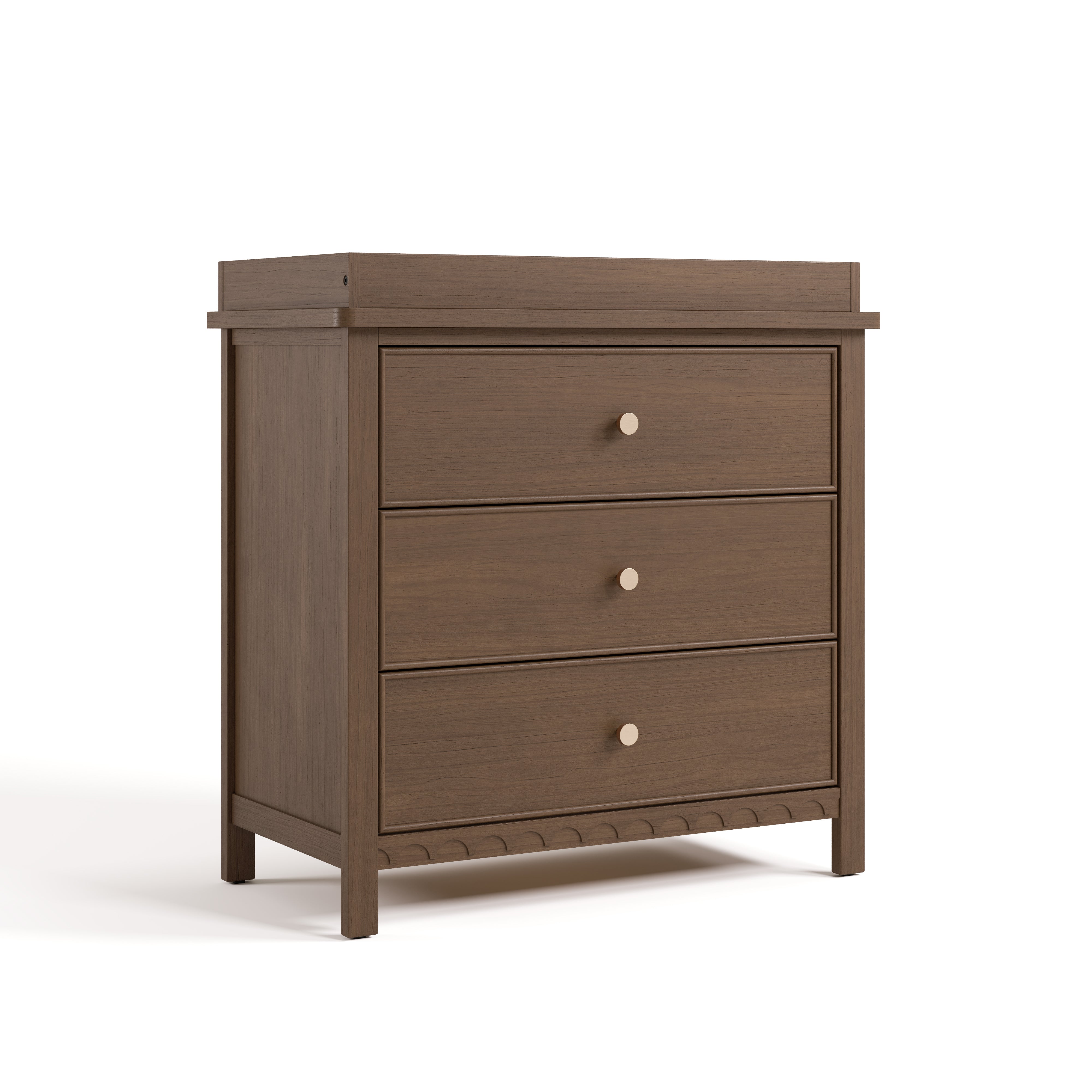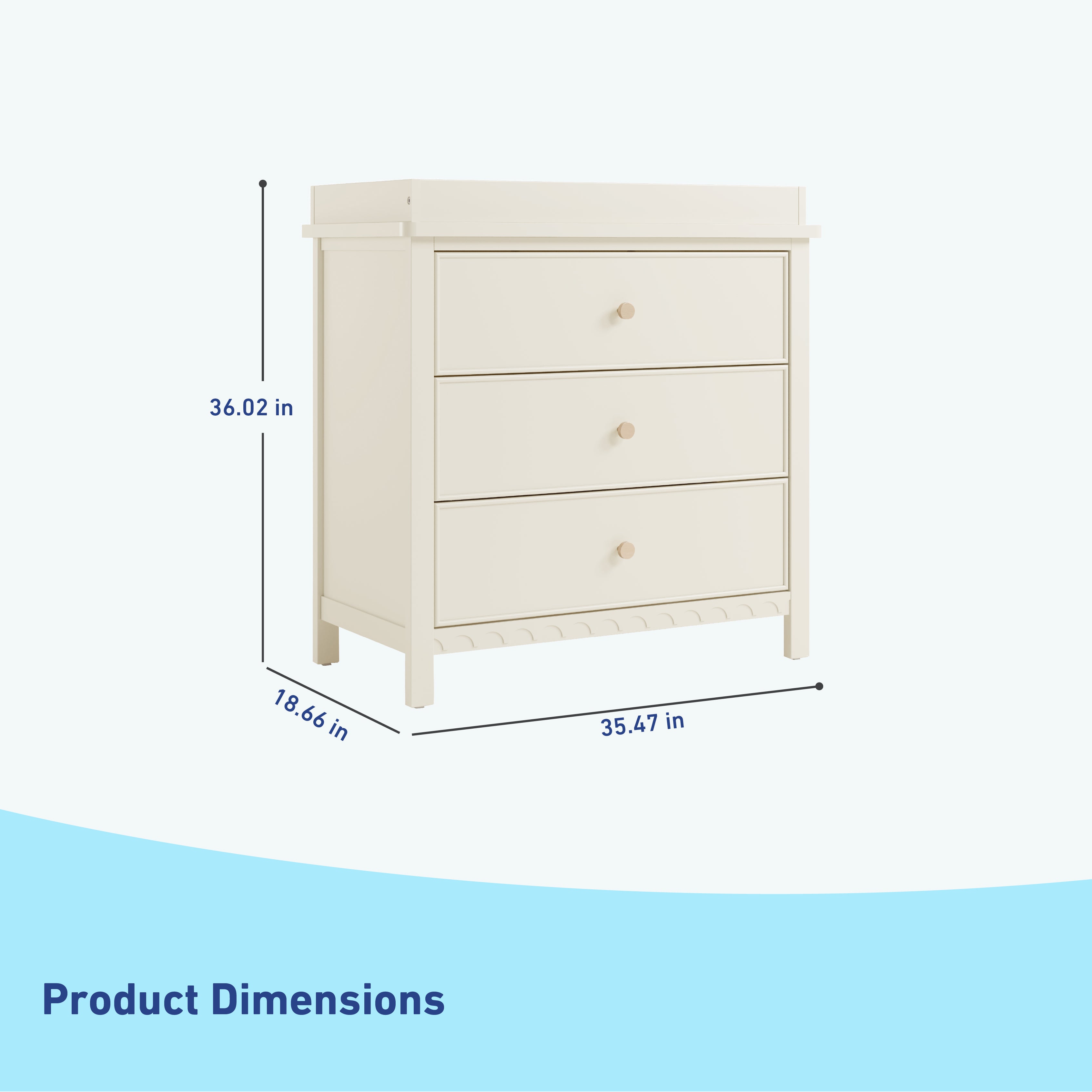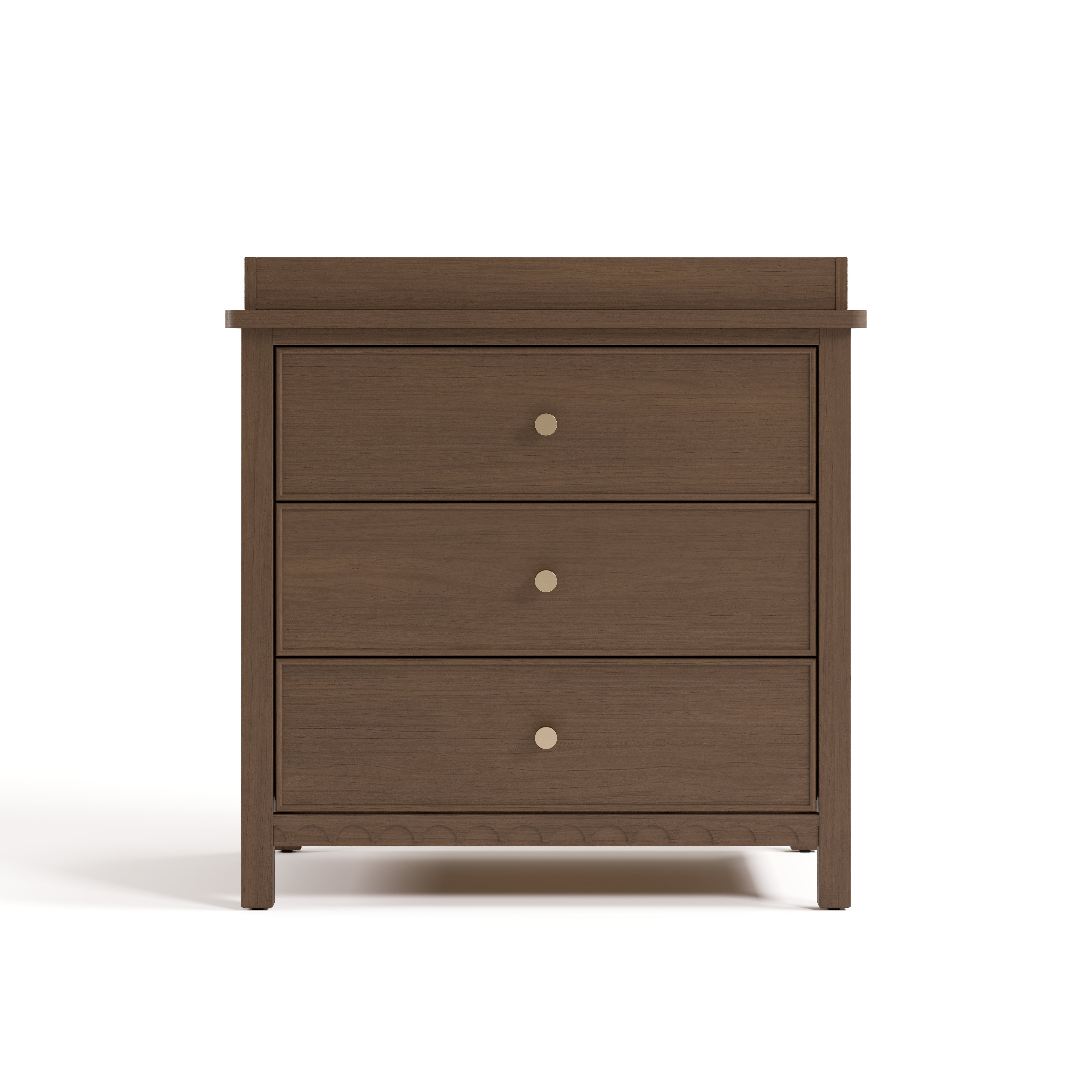 functionality, featuring elegant scalloped carved detailing at the base and three spacious drawers with a removable changing topper.