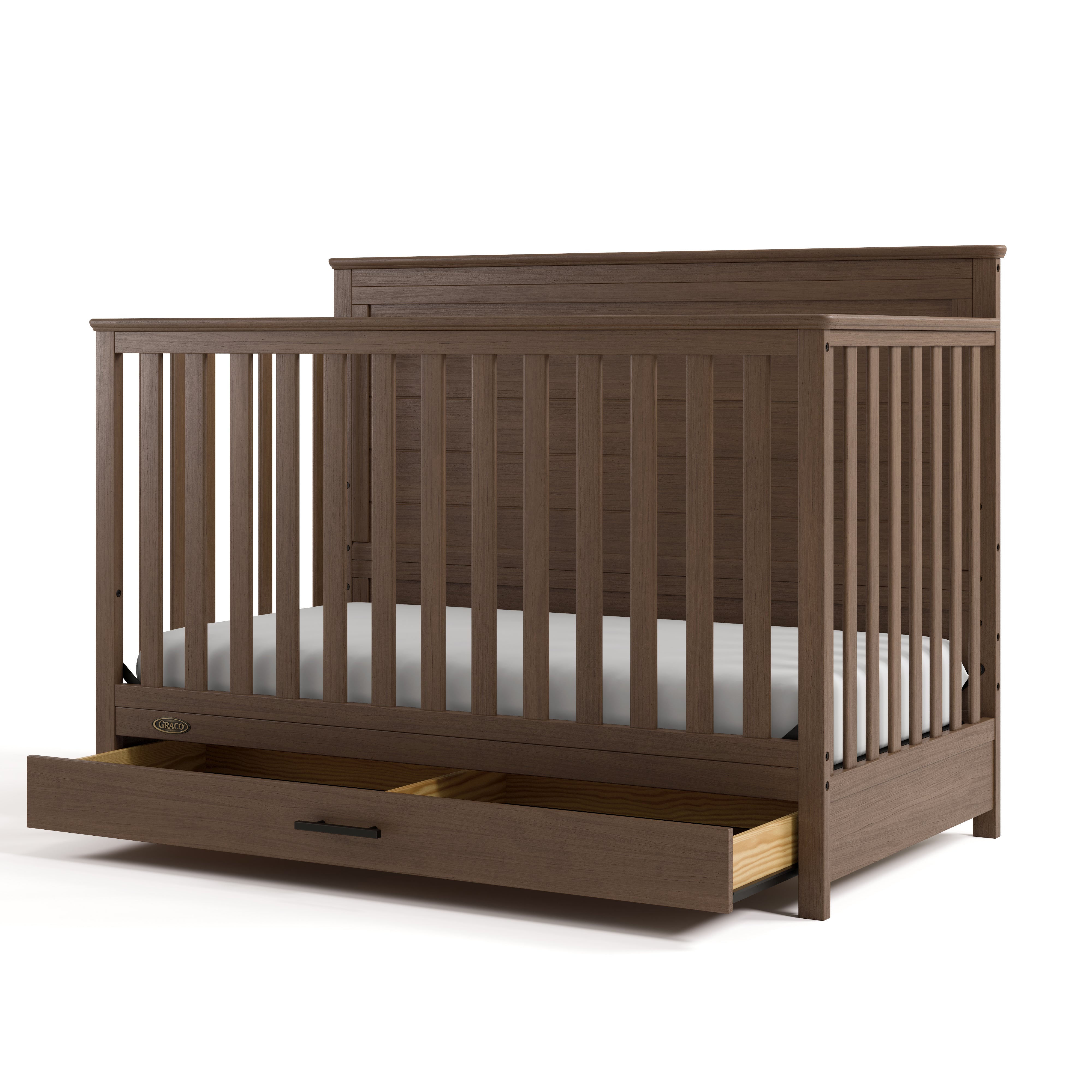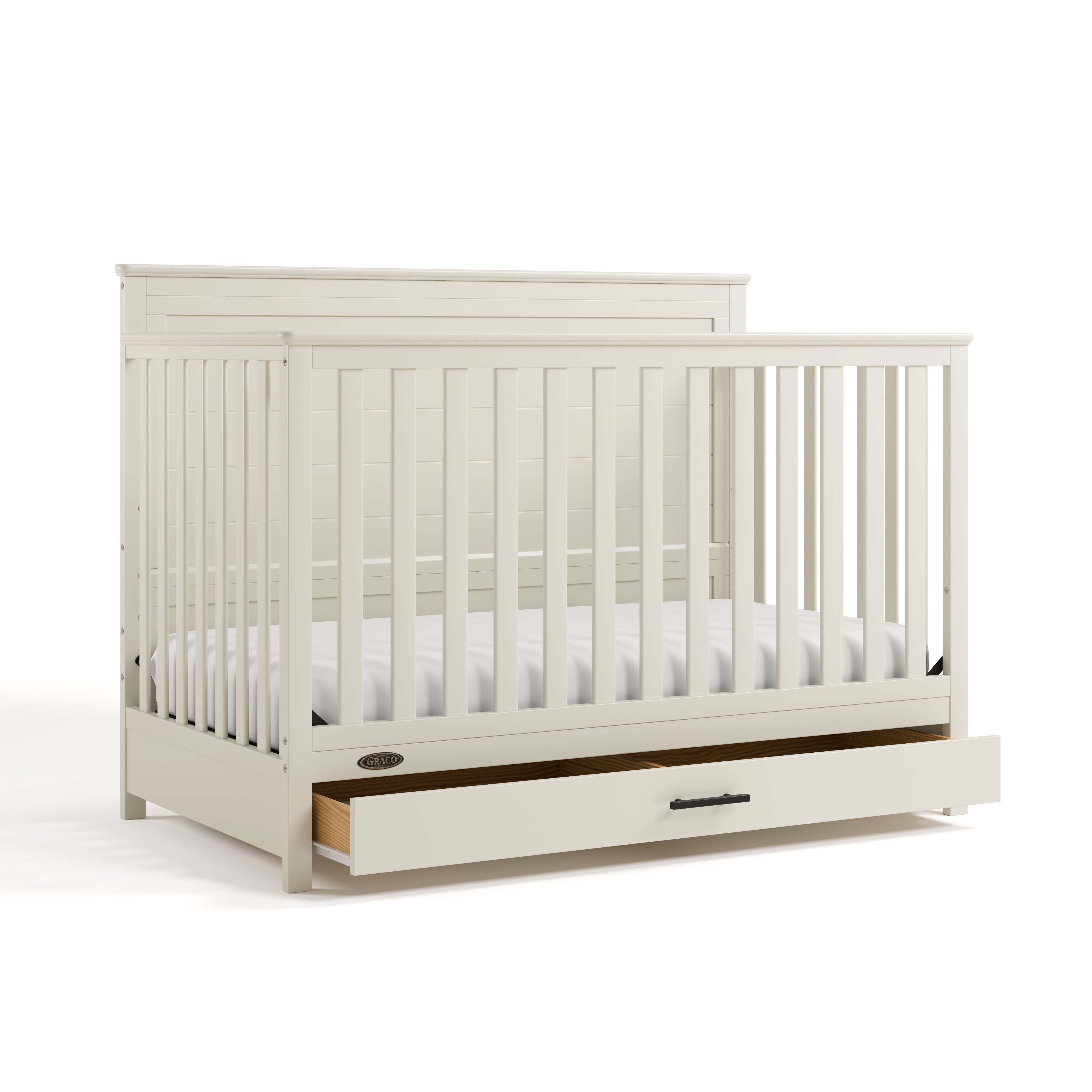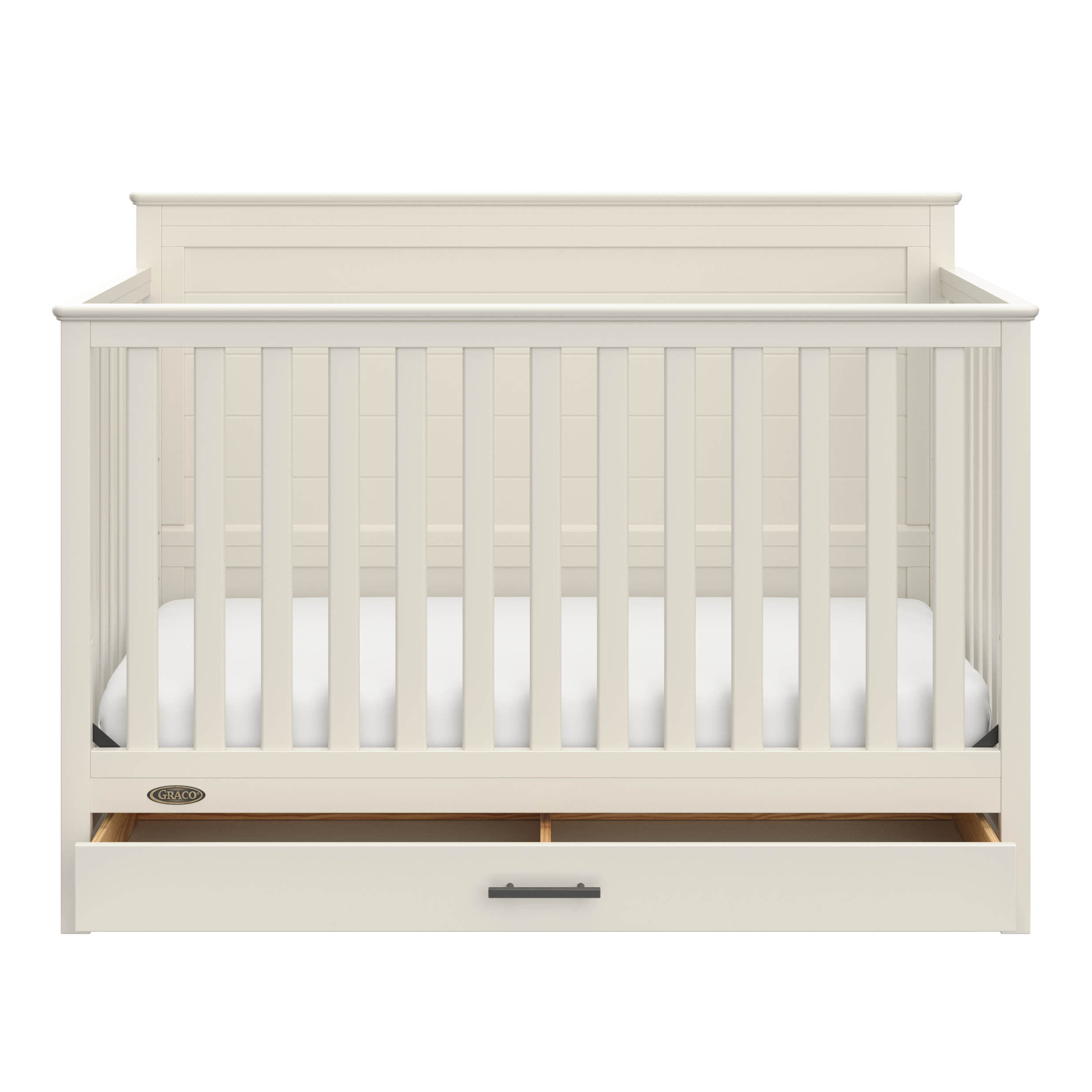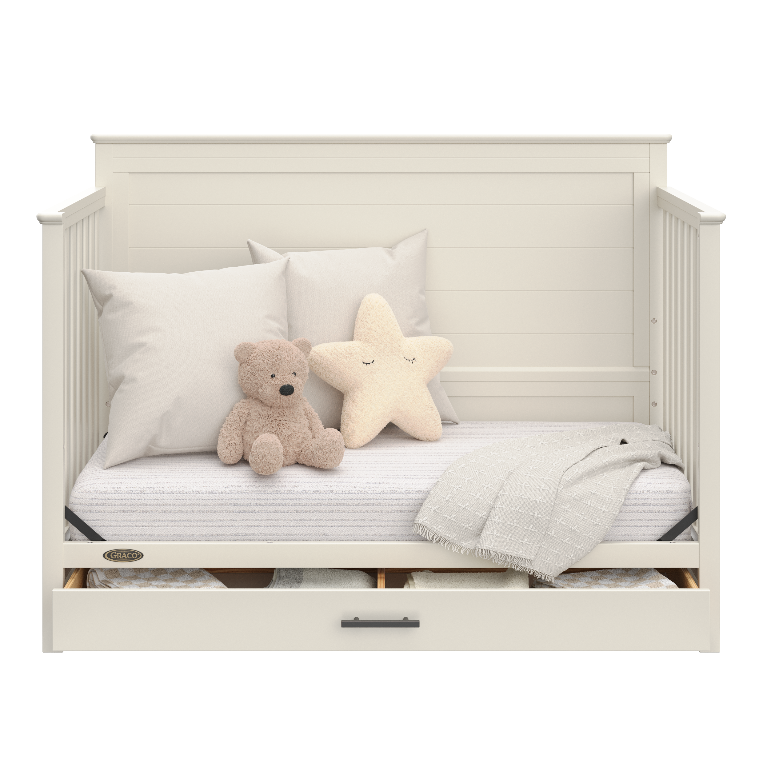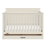 Meet our Graco® Tristan 5-in-1 Convertible Crib! This elegant crib features a spacious drawer with a sleek black metal handle, perfect for storing your baby's essentials. Its solid headboard, adorned with stylish grooves and decorative molding, adds a timeless touch that enhances any nursery decor.