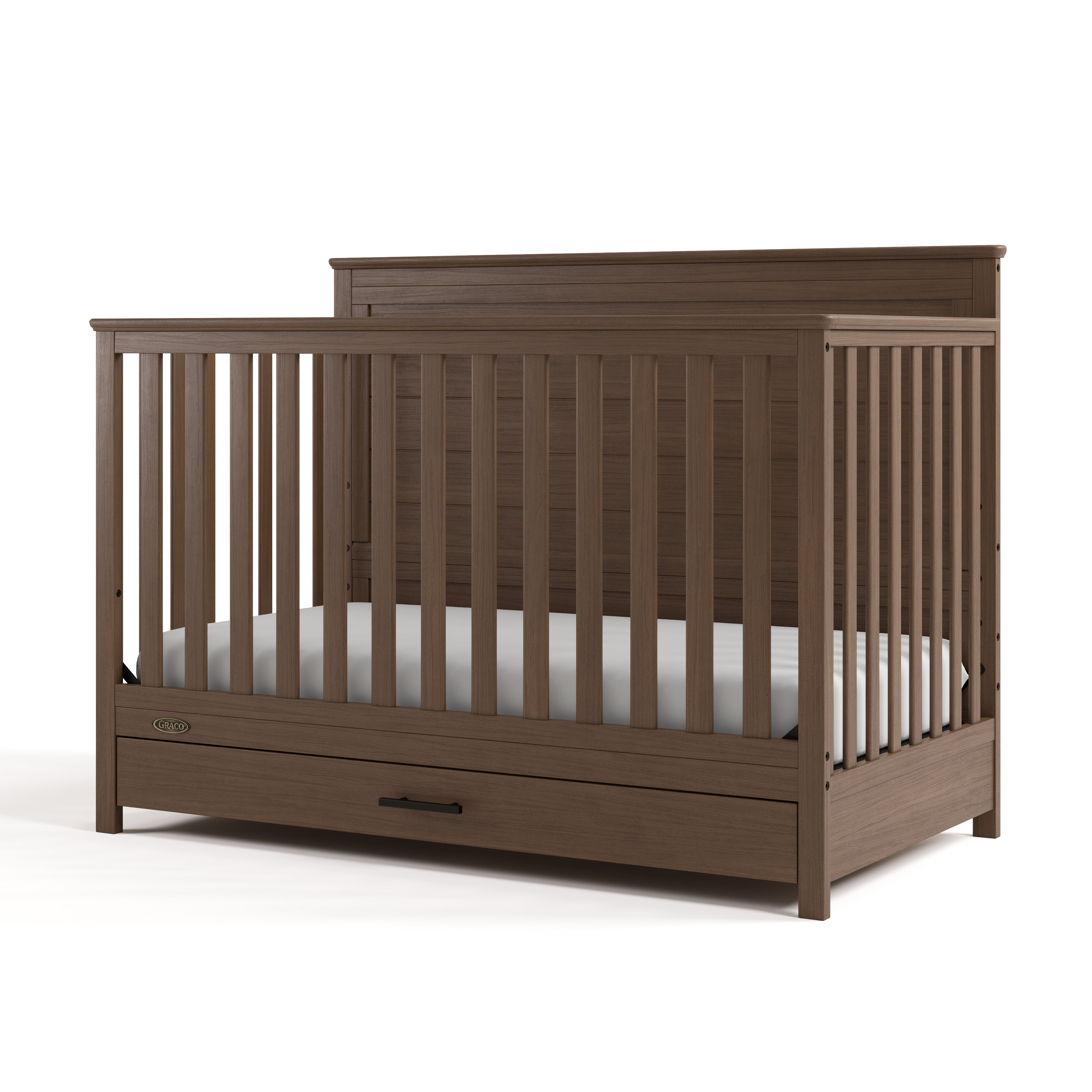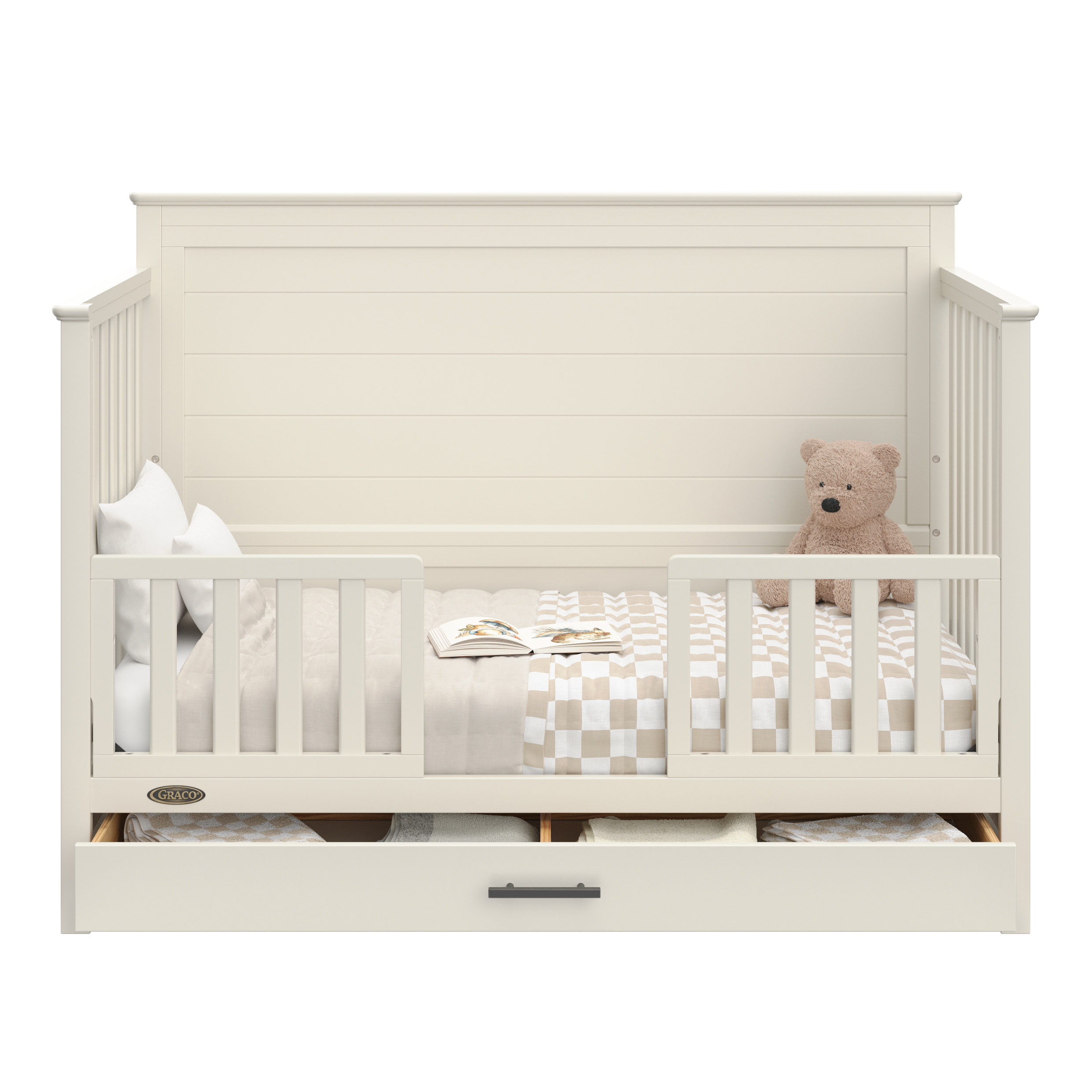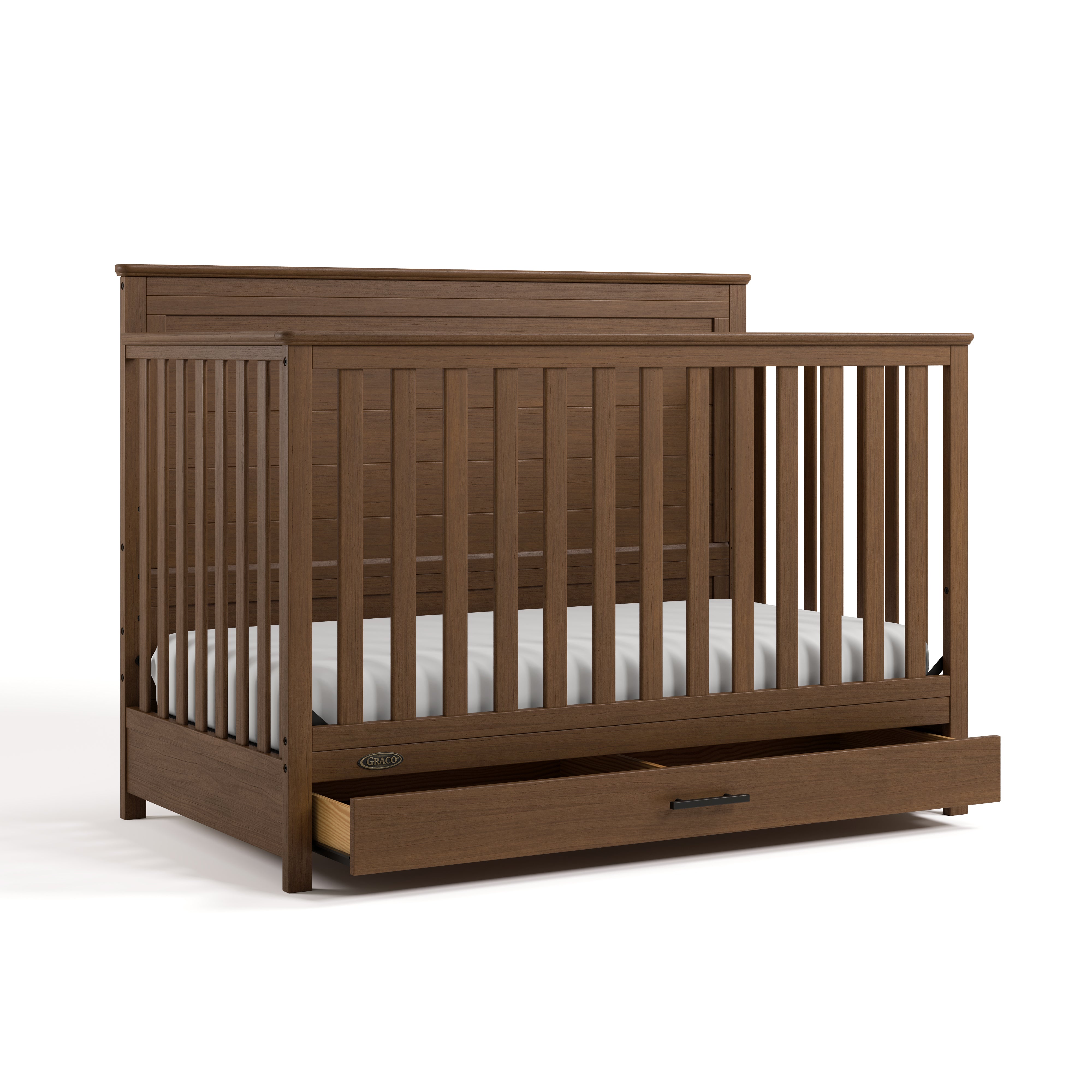 Meet our Graco® Tristan 5-in-1 Convertible Crib! This elegant crib features a spacious drawer with a sleek black metal handle, perfect for storing your baby's essentials. Its solid headboard, adorned with stylish grooves and decorative molding, adds a timeless touch that enhances any nursery decor.
