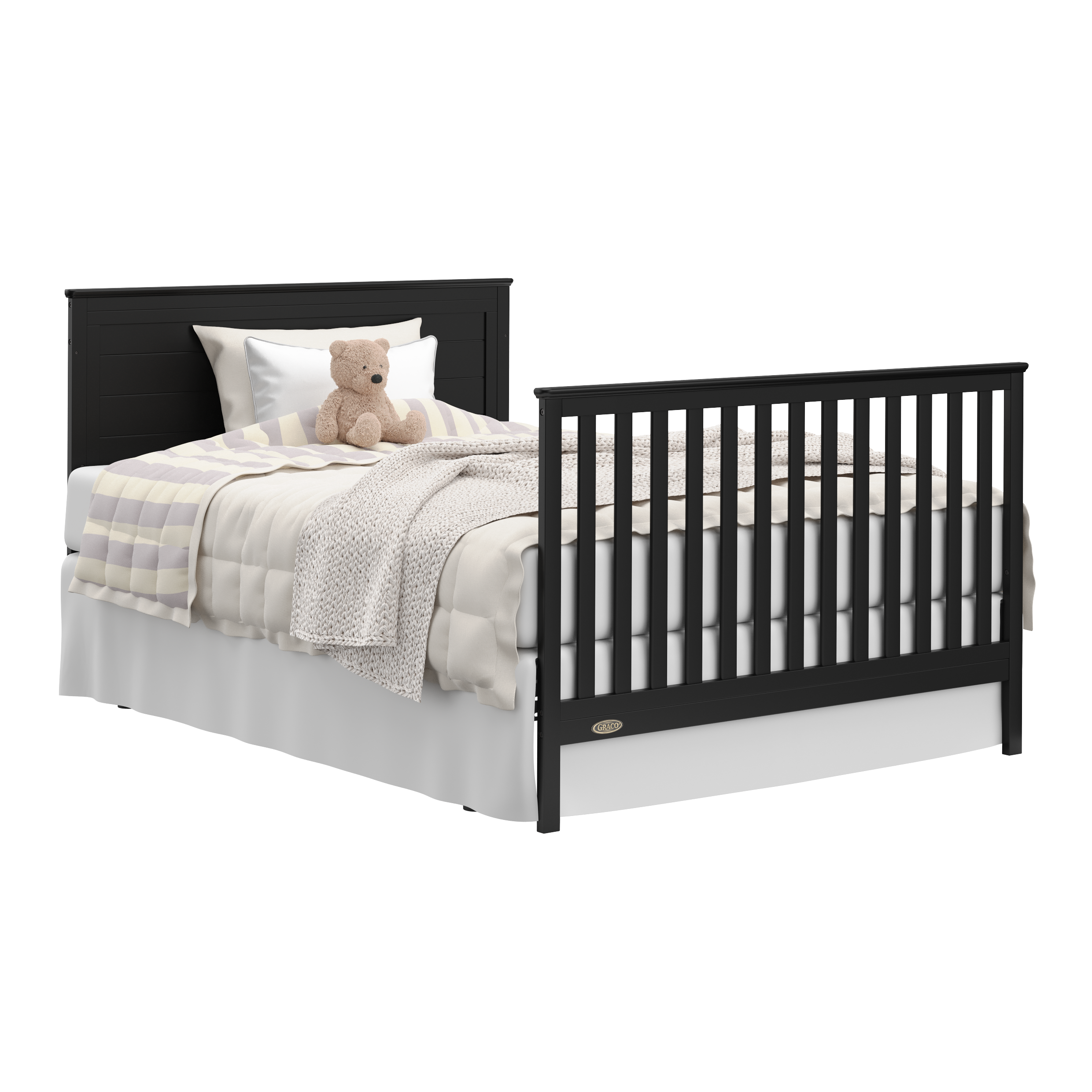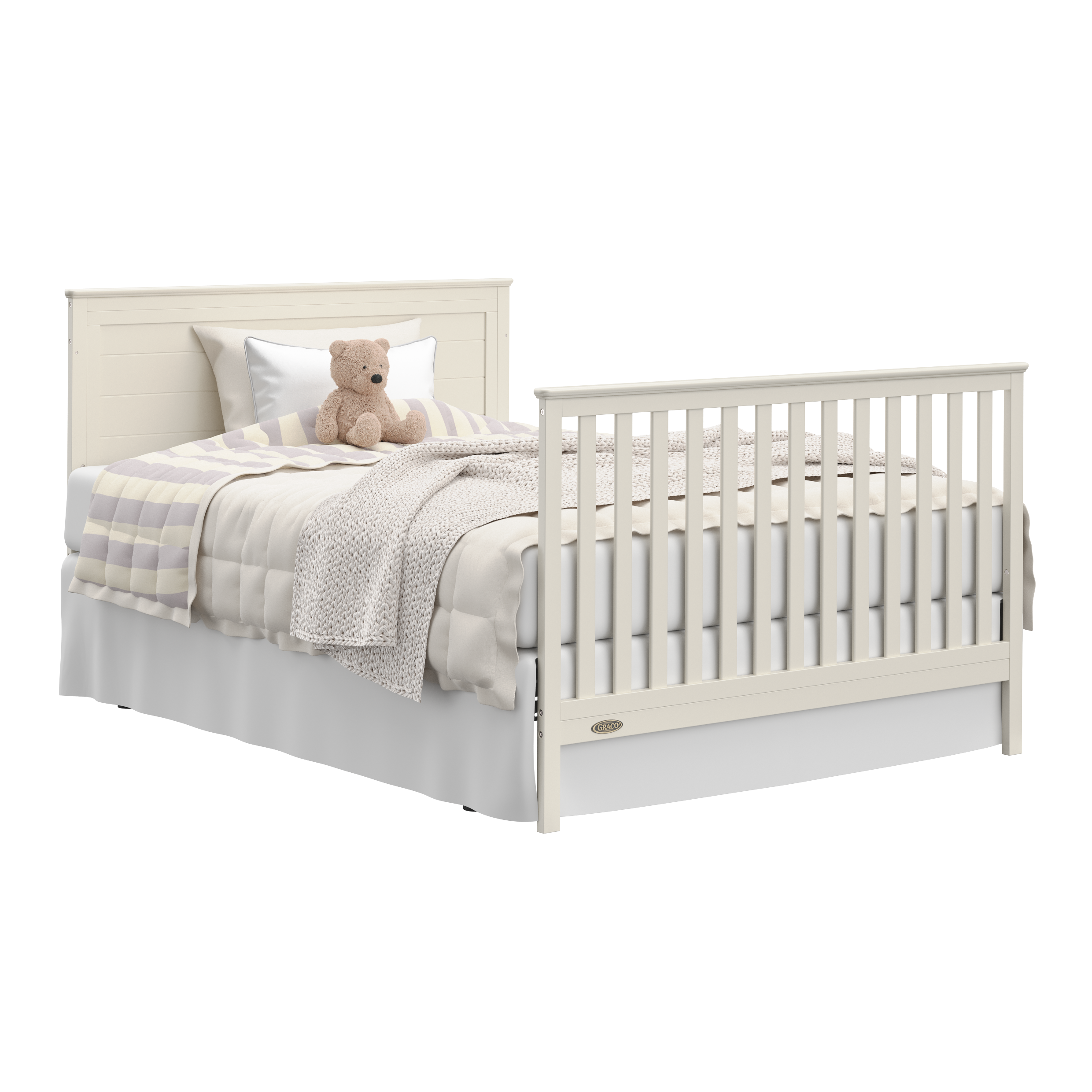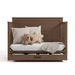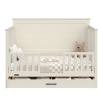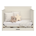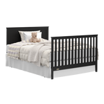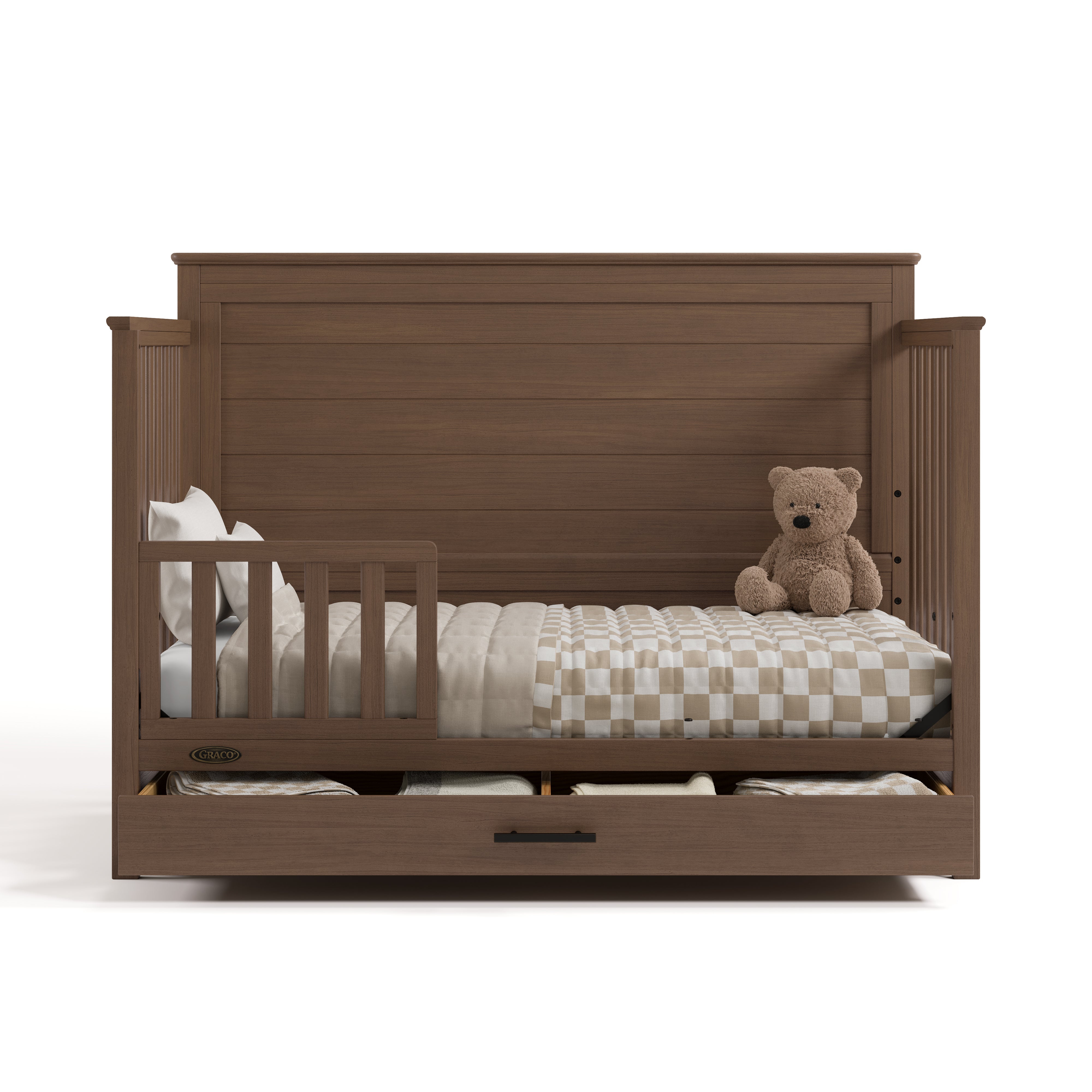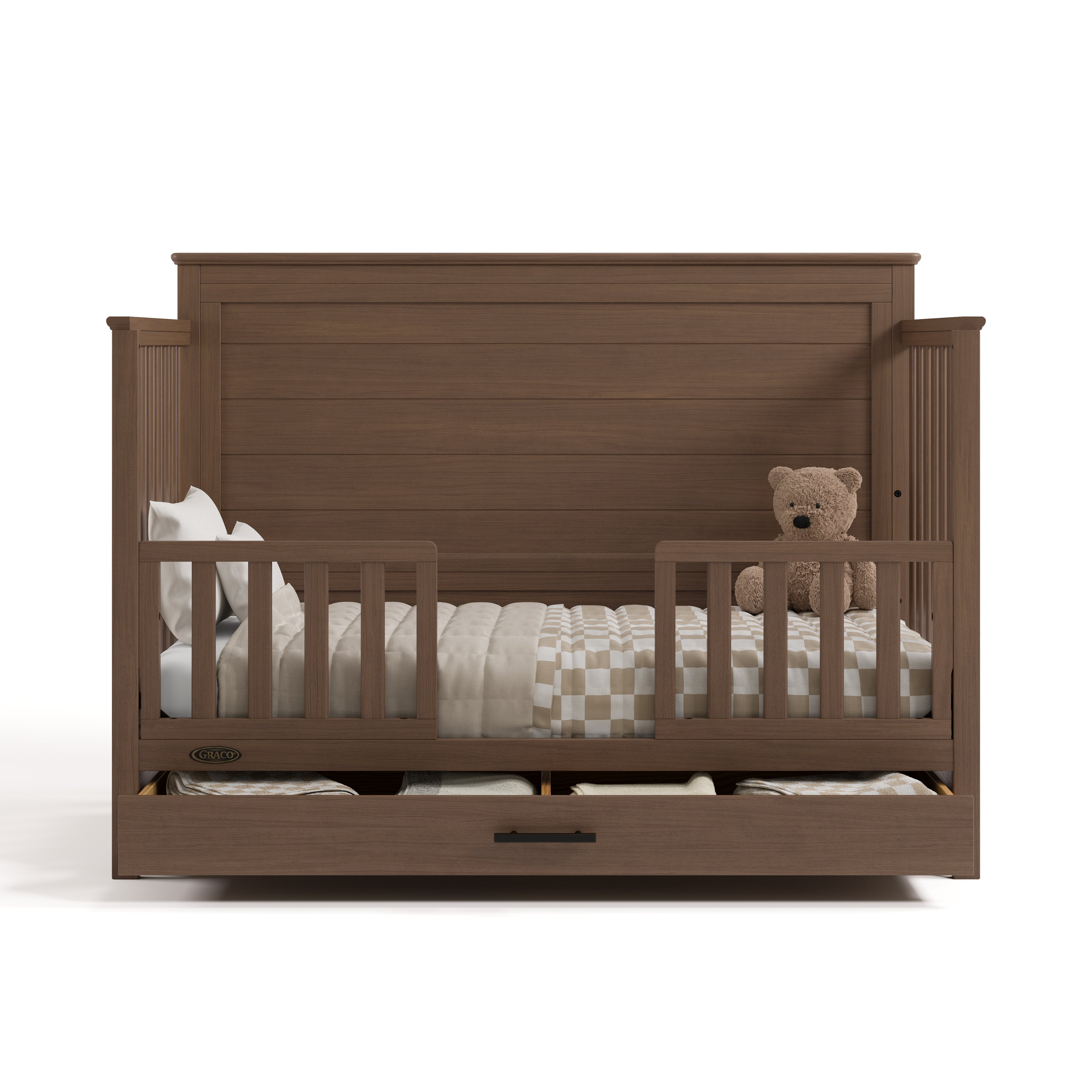 Meet our Graco® Tristan 5-in-1 Convertible Crib! This elegant crib features a spacious drawer with a sleek black metal handle, perfect for storing your baby's essentials. Its solid headboard, adorned with stylish grooves and decorative molding, adds a timeless touch that enhances any nursery decor.