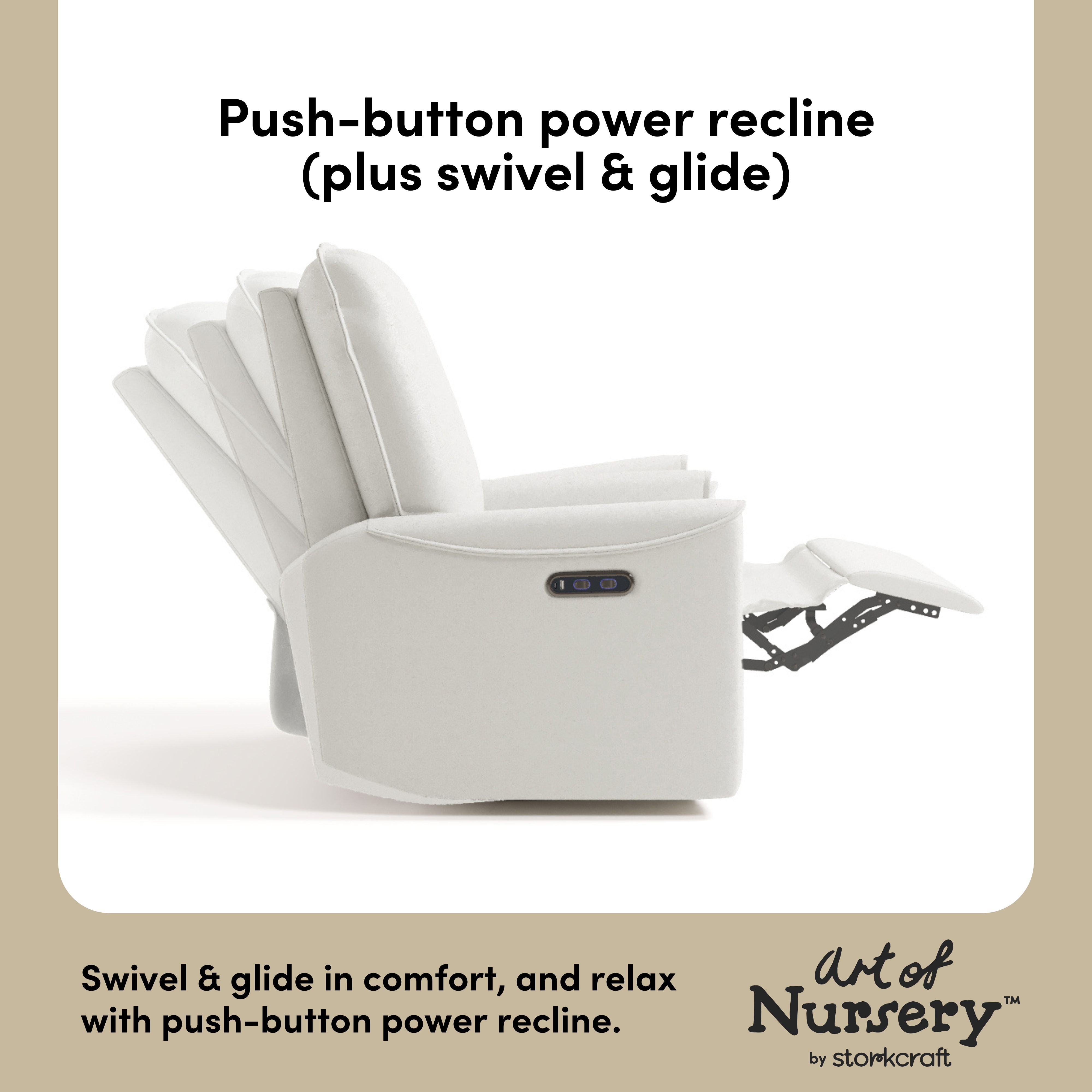 - PUSH-BUTTON RELAXATION — PREMIUM ELECTRONIC POWER RECLINER SWIVEL GLIDER: Storkcraft’s most premium nursery recliner, highlighted by its beautiful flange upholstery and modern style, designed to effortlessly recline (and sit up) with the push of a button
