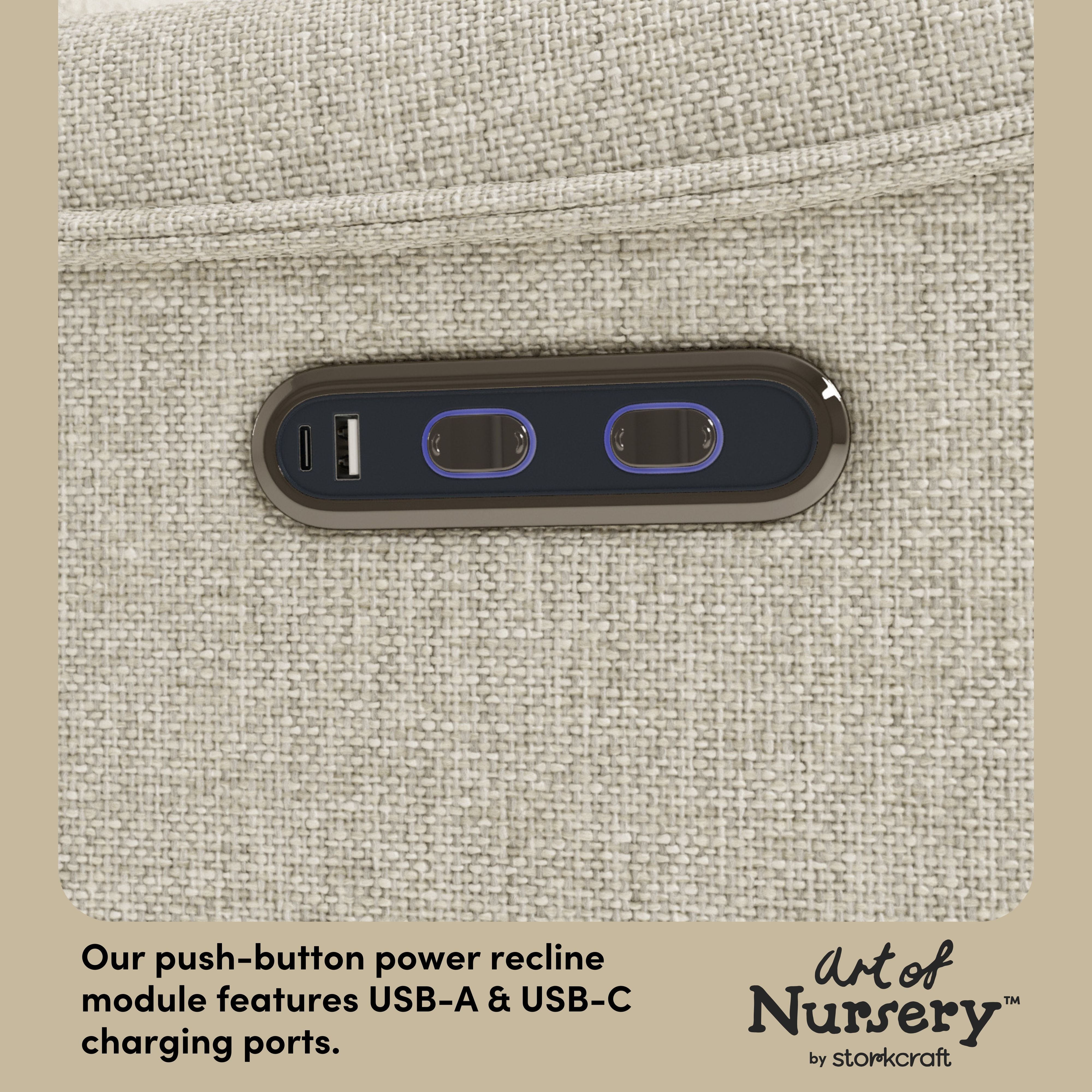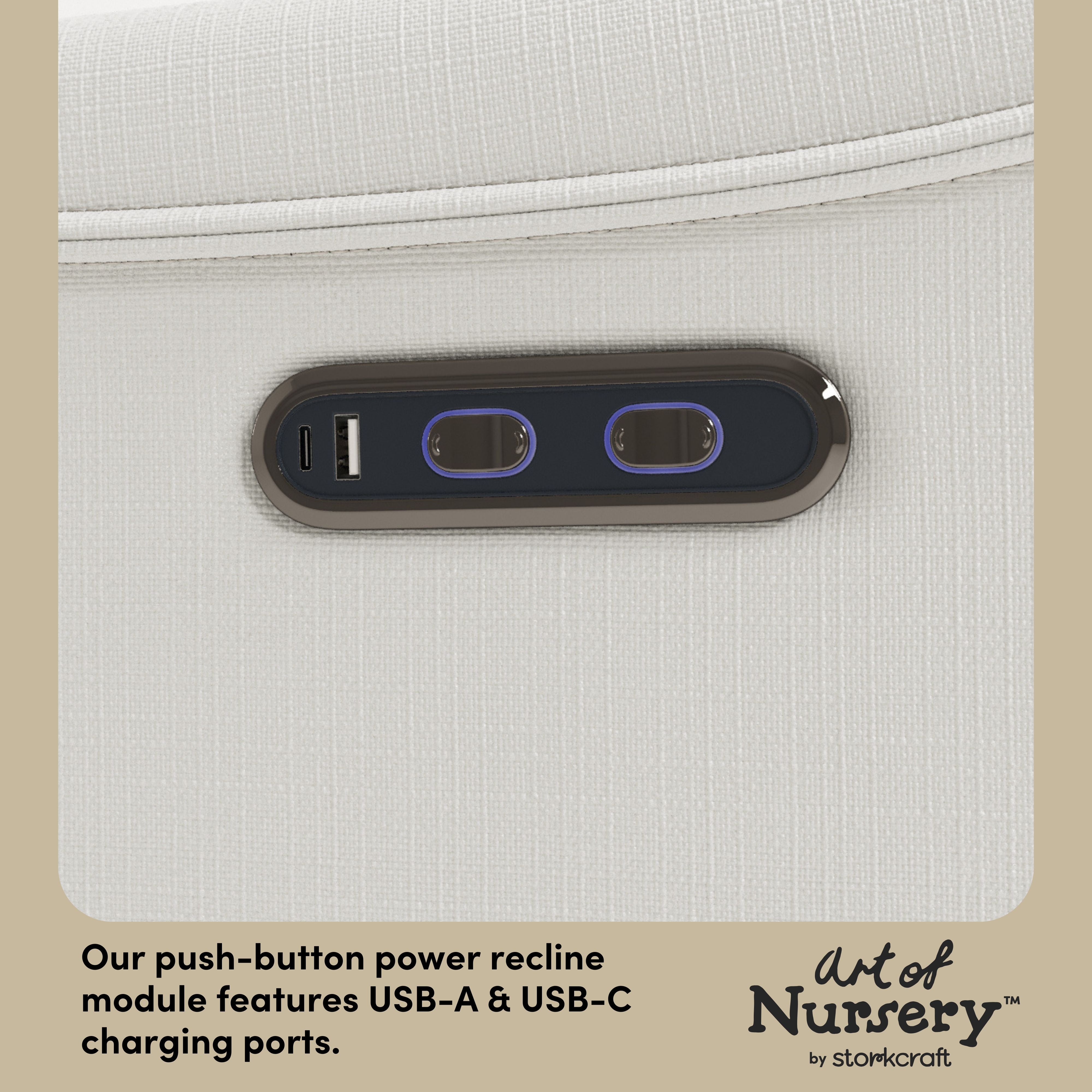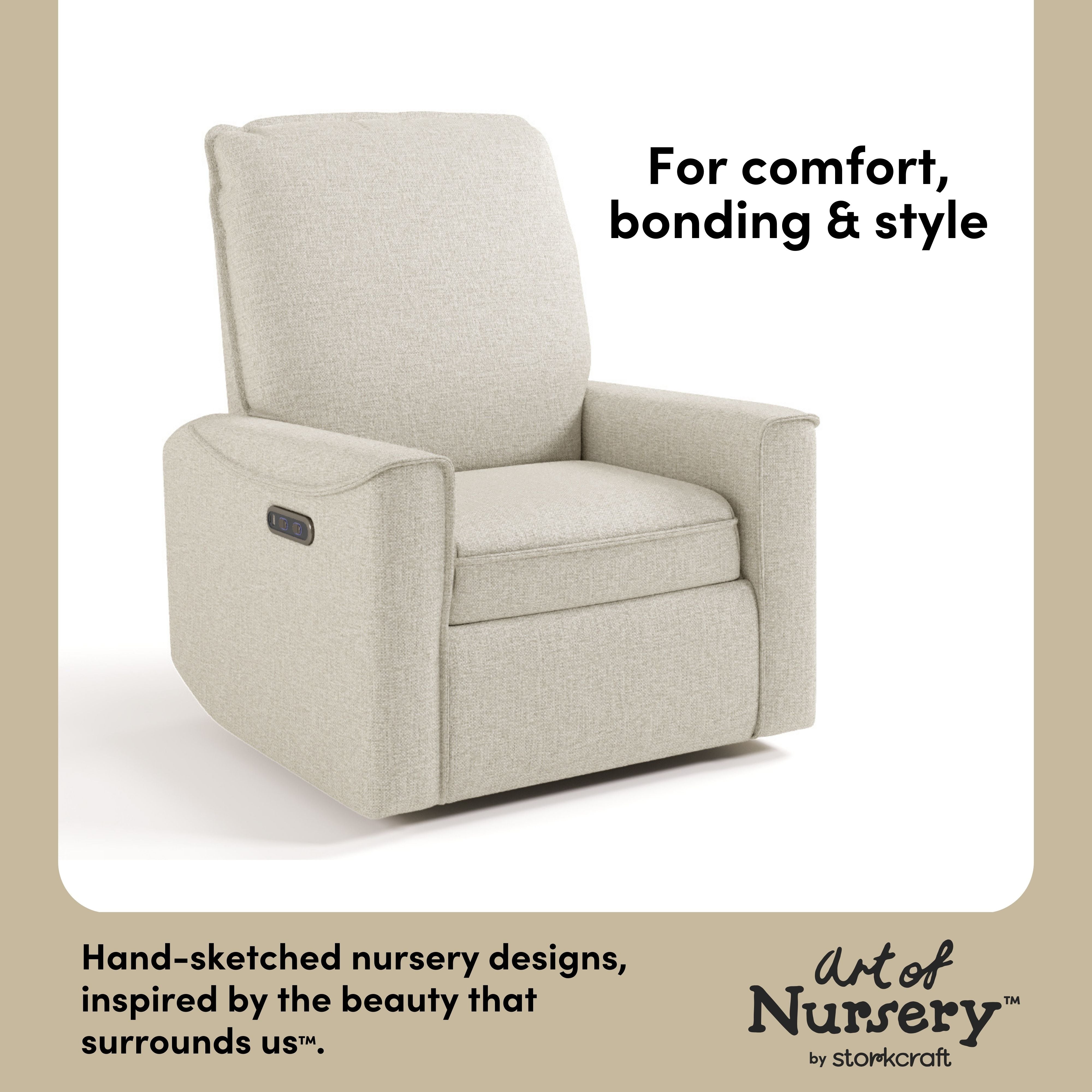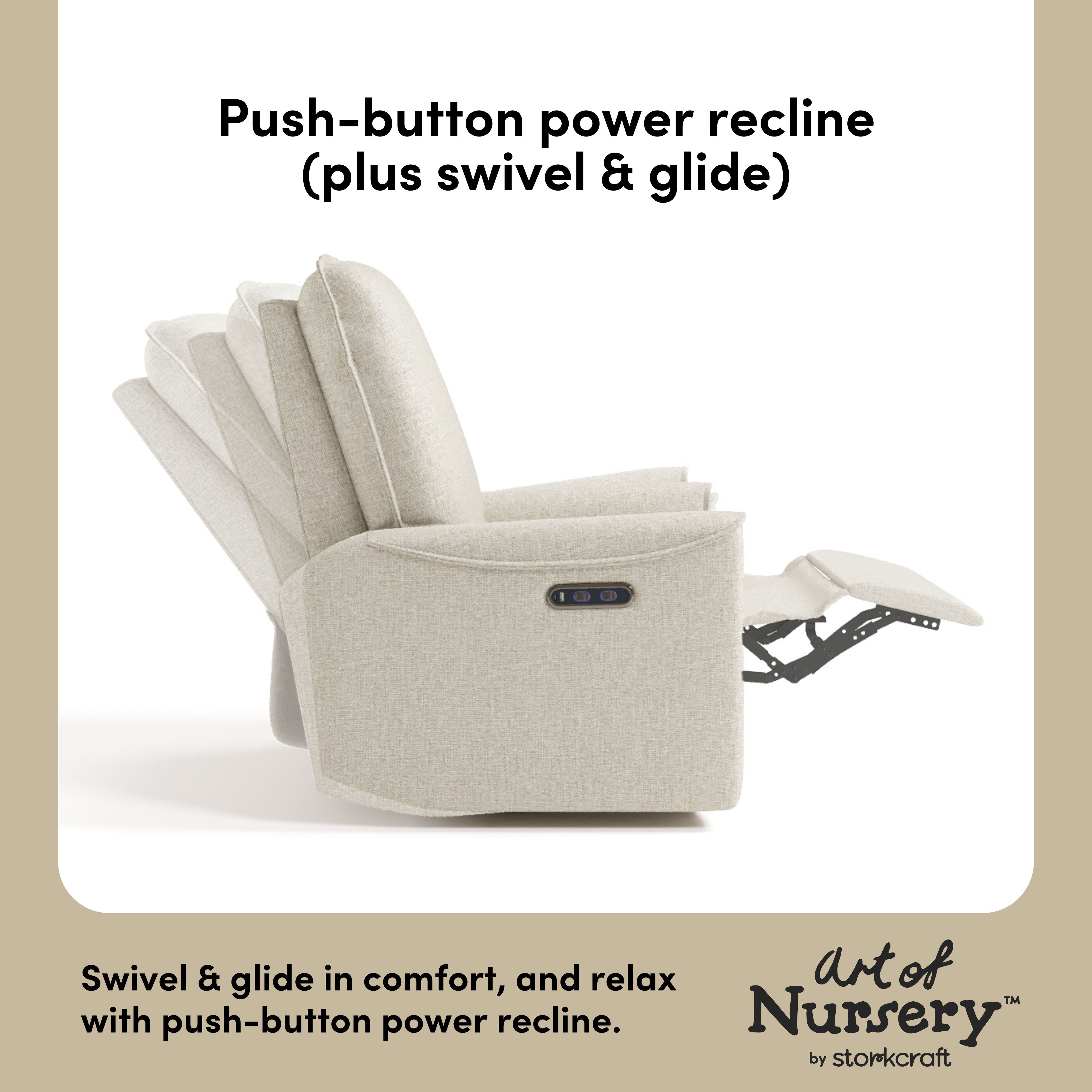 - PURE NURSERY BLISS — FROM STORKCRAFT’S MOST LUXURIOUS COLLECTION: Our premium, in-house designed nursery power recliner swivel glider features push-button power recline, hand-selected fabrics, refined tailoring, a durable metal base, and 2 USB chargers